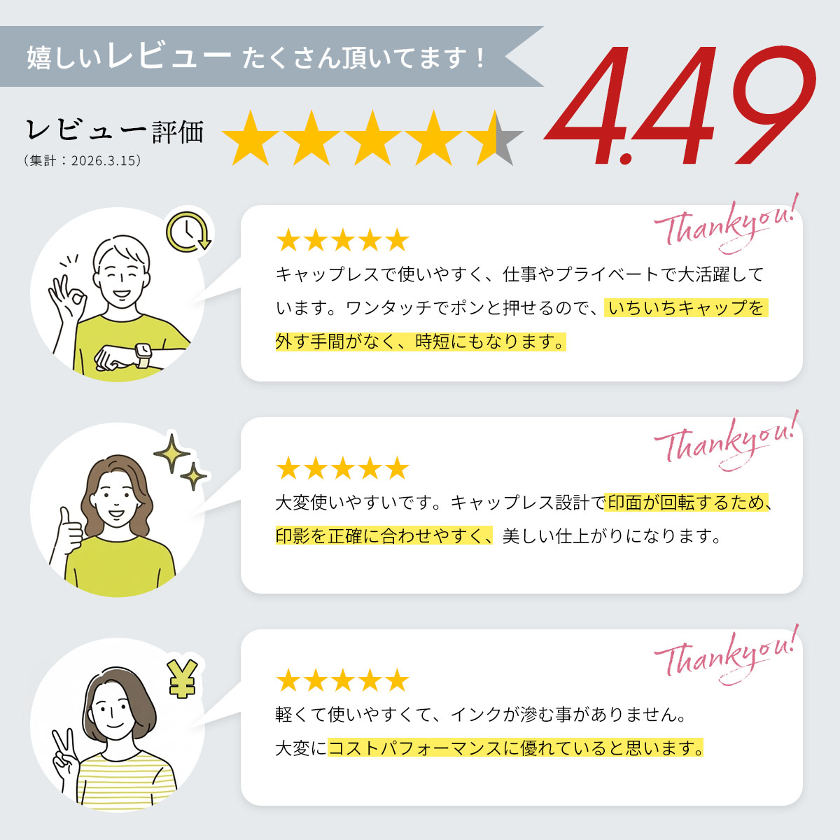 キャップを探す手間や朱肉を用意する面倒から解放され、毎日の押印作業がよりスマートになります。