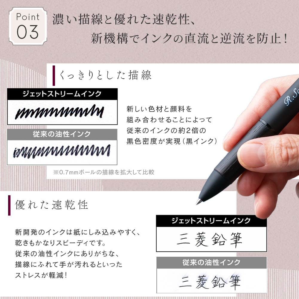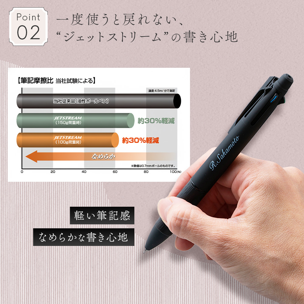 ジェットストリームの超低摩擦インクを搭載。長時間の筆記でも疲れにくく、文字が美しく書けます。