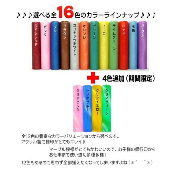 全12色のラインナップで、お仕事からお子様の銀行印等、幅広くお使い頂ける印鑑です。 アクリル樹脂製は朱肉の付きも良く、耐久性にも優れています。