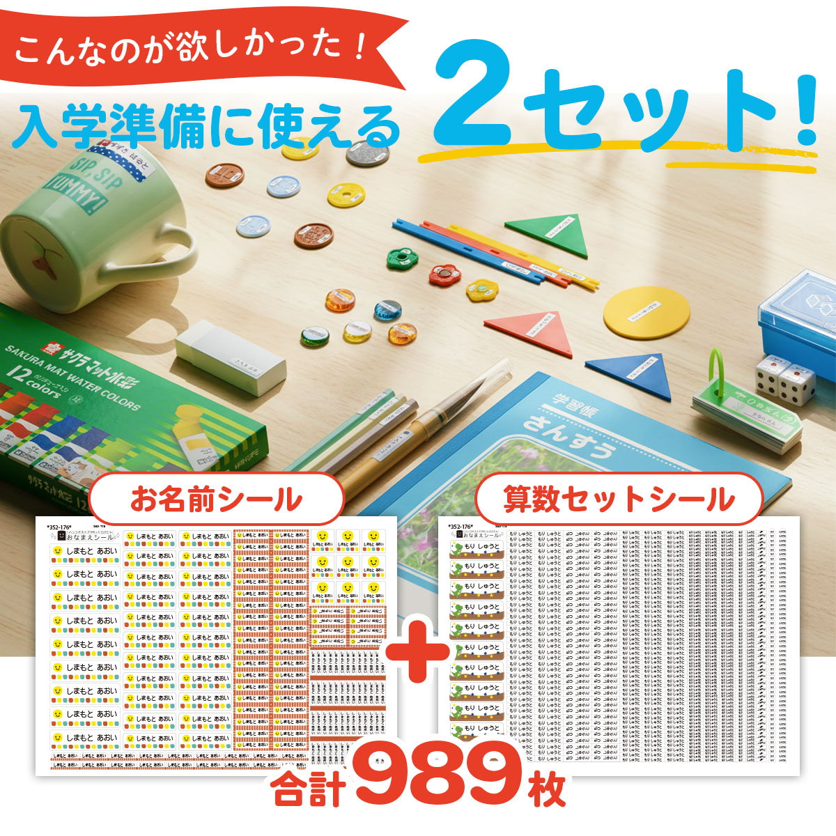 お名前シール + 算数セット 2点セット 入学準備セット 大容量989枚 おなまえシール 算数セット 保育園 幼稚園 小学校 食洗機 レンジ 防水 漢字 おなまえシール