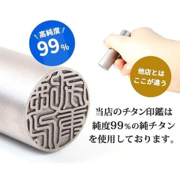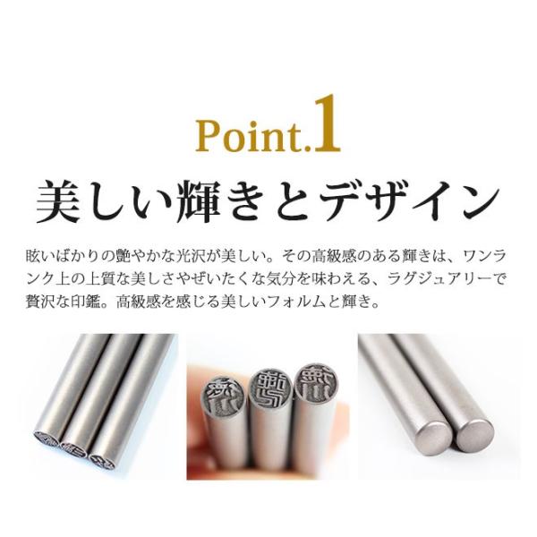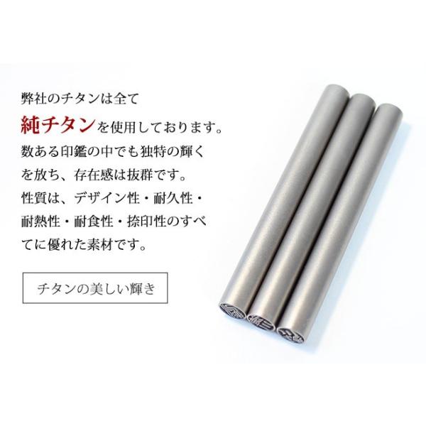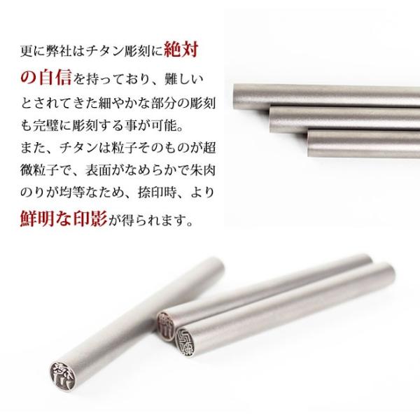 弊社のチタン 印鑑は全て純チタンを使用しております。数ある印鑑の中でも独特 の輝きを放ち存在感は抜群です。性質は、耐食性、耐久性に優れた素材です。更に弊社はチタン彫刻に絶対の自信を持っており難しいとされてきた細かな部分の彫刻も完璧に彫刻することが出来ます。 また、チタンは粒子そのものが超微粒子で、表面が滑らかで朱肉のりが均等なため、捺印時、より鮮明な印影が得られます。