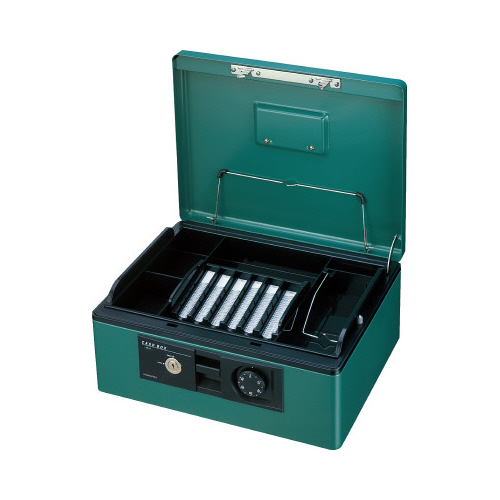 ●サイズ/A4●付属品/鍵2個付●カラー/緑●質量/3.7kg●寸法/外寸法:幅360×奥行285×高さ150mm●内寸法/幅318×奥行228×高さ79mm●材質/本体:鋼板(焼付塗装)、本体ケース・トレー・前面パネル:ABS●錠タイプ/シリンダー錠・ダイヤル錠●その他機能/フタはね上げ調節付き、書類押さえ(フタ裏)付き●種別/コインカウンター付きトレー