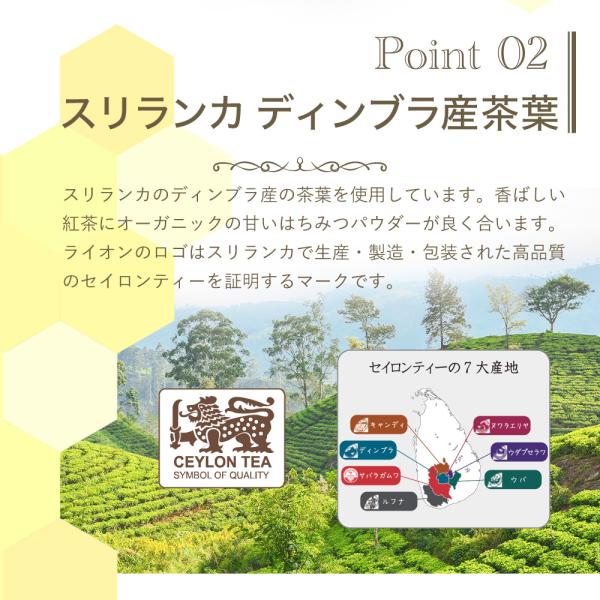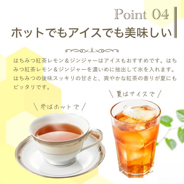 ■贅沢な甘みと爽やかな刺激 ドイツ産はちみつパウダーと、高級茶葉ディンブラを100%使用。レモンの酸味とジンジャーのスパイスが効いた、砂糖いらずの本格派フレーバーティーです。1杯約7kcalとヘルシーで、温活やリラックスタイム、喉のケアにも最適。アイスでも美味しく楽しめます。