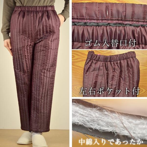 軽くてあたたかな中綿入りキルティングパンツです。安心の日本製。重ねばき対応で暖かく過ごせます。 股上が深くお尻回りがゆったりして、左右には大きくて深い便利なポケット付き。ポリエステル100%なのでお手入れも簡単です。 5色からお選びください。