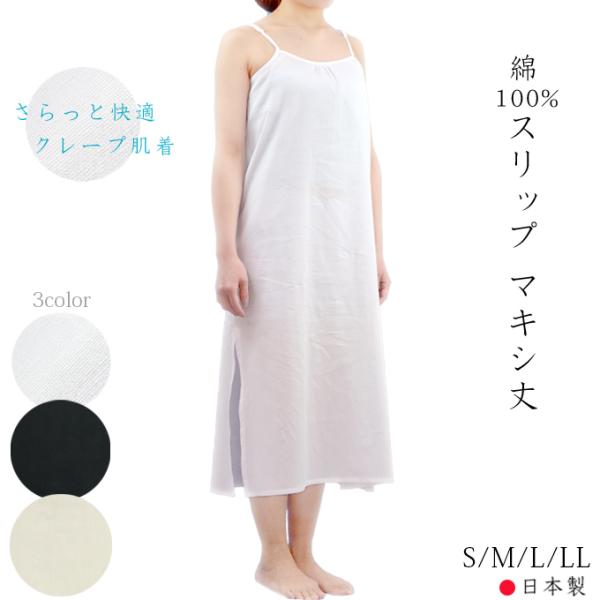 スリップ マキシ丈 綿100% アジャスター付 肩紐調整可日本製 (S/M/L/LL) クレープ肌着