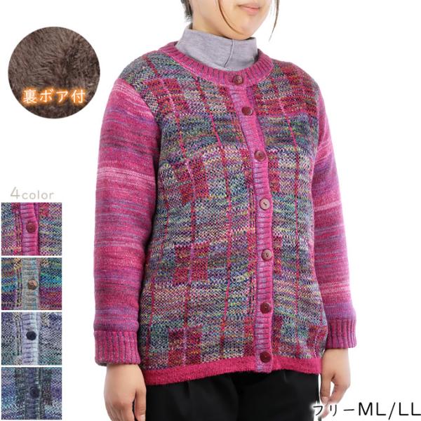 裏ボア付きニット毛混カーディガン 丸首 長袖 前開き 暖かジャケット ML/LL シニア レディース 秋冬 あったか おしゃれ 婦人服 60代 70代 80代