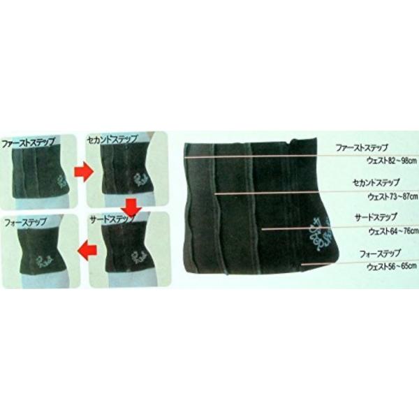 【4段階切換】:(1ステップ:ウエスト82cm〜89cm、2ステップ:ウエスト73cm〜84cm、3ステップ:ウエスト64cm〜76cm、4ステップ:ウエスト56cm〜65cm)