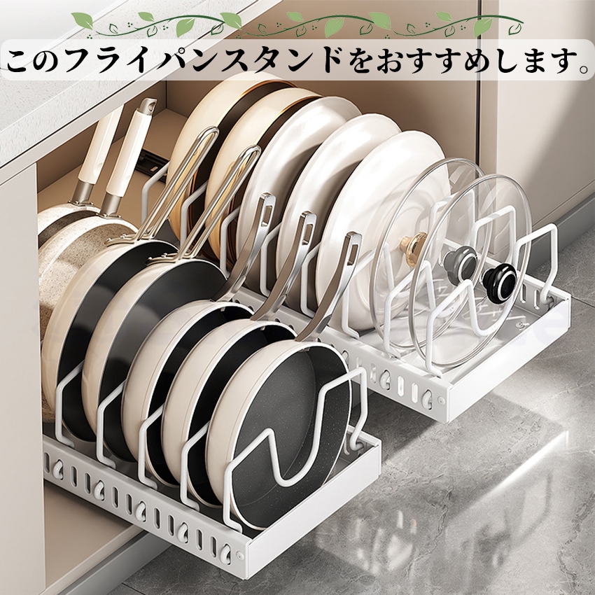 フライパンスタンド 引出し式 スライド 伸縮 コンロ下 シンク下 フライパン収納 キッチン収納 鍋 なべ 蓋 立てる収納 調理器具 フライパン置き キッチン