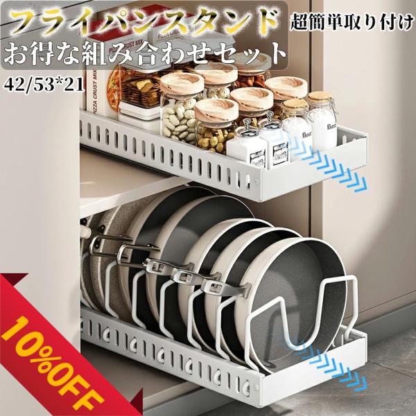 フライパンスタンド 引出し式 スライド 伸縮 コンロ下 シンク下 フライパン収納 キッチン収納 鍋 なべ 蓋 立てる収納 調理器具 フライパン置き キッチン