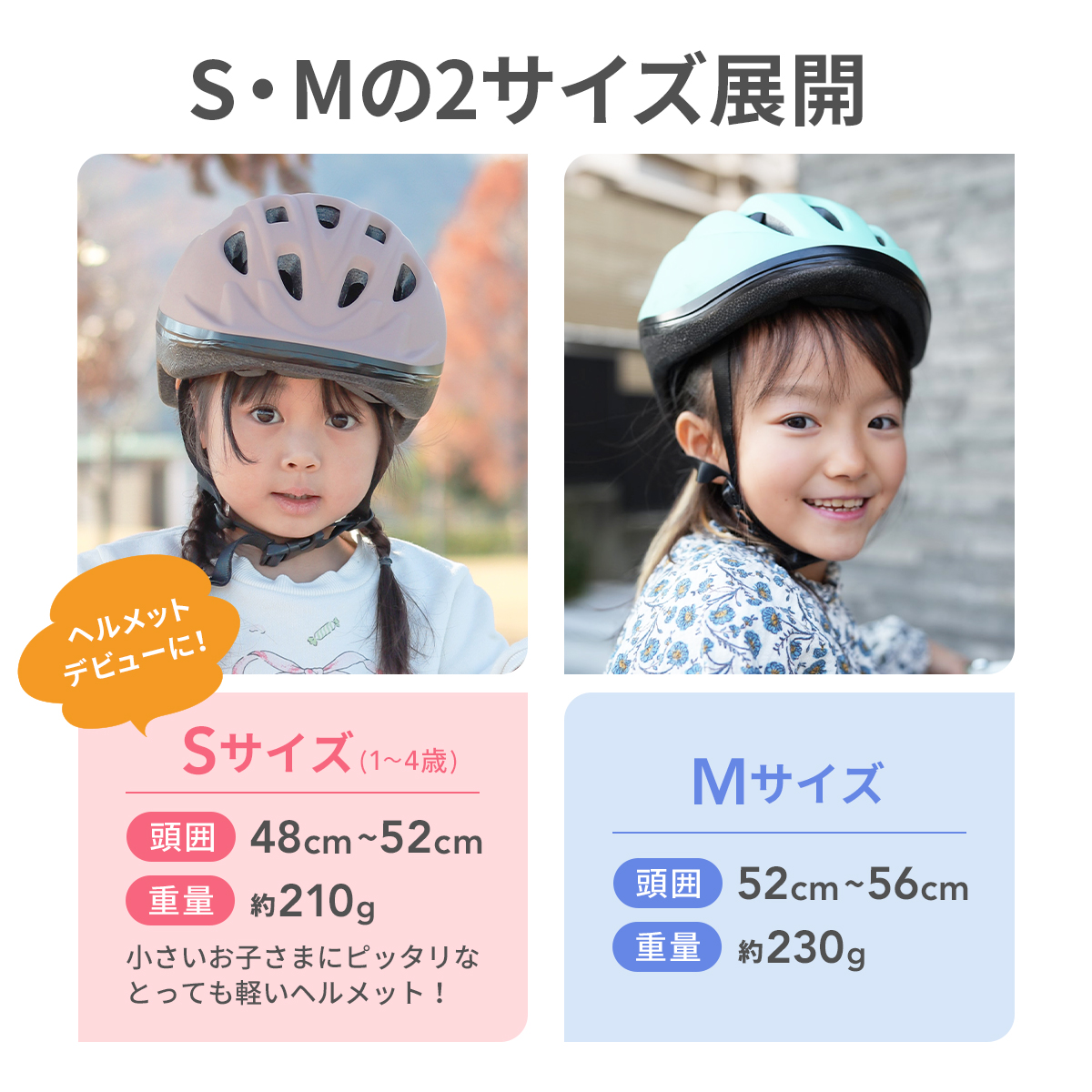 大切なお子様を守る!キッズヘルメットSサイズ☆お子様に嬉しい、とっても軽いヘルメット!ダイヤル式のバックルでサイズ調整ができるので、成長に合わせて頭にしっかりフィットさせられます!厳しい試験をクリアしたヘルメットなので、安心して使用できます!【子供のヘルメット着用は保護者の義務】13歳未満の子供が自転車に乗る場合(子供を乗せ自転車に同乗する場合も含む)、ヘルメットを着用させることが保護者の努力義務となりました。子供は頭骨が十分に形成されていないことに加え、身体の大きさに比べ頭部が重く、転倒すると頭部にケガをしやすいので、ヘルメットの着用は子供の頭を守るためにとても重要です。
