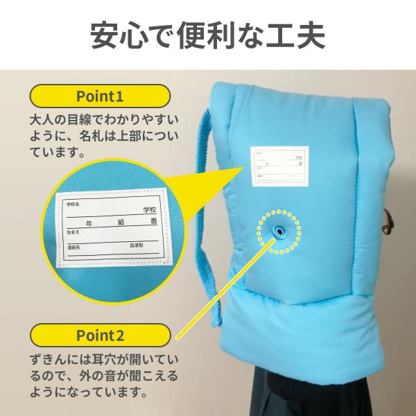 燃えにくい素材&衝撃に強い!防災ずきんMT☆中綿たっぷりで衝撃に強く、難燃加工繊維を使用しているので、お子様の頭をしっかりと守ります!ゴムバンドは取り外しが簡単で、そのままイスにかけることができて便利!!大人の目線で見て名前が確認しやすいように、名前のラベルが上部についています!外の音が聞きやすい耳あながついているので、すっぽり頭にかぶっても安心です!