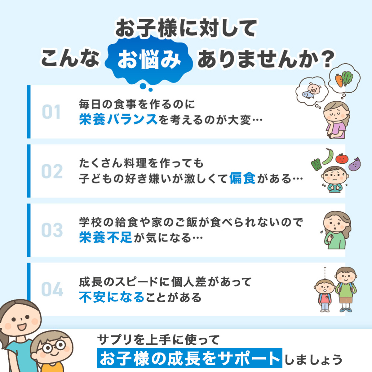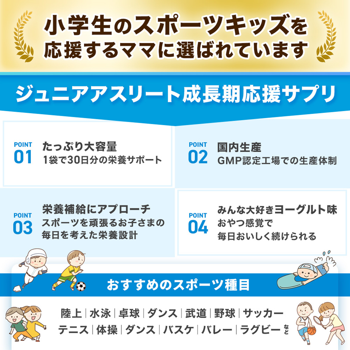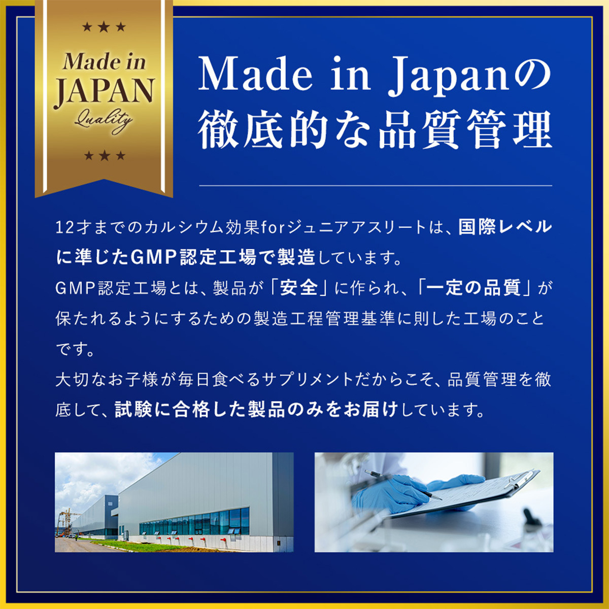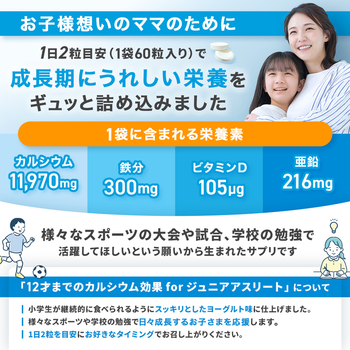 12才までのカルシウム効果forジュニアアスリート☆様々なスポーツや学校の勉強で活躍してほしいという願いから生まれたサプリです!小学生のお子さまの毎日を考えた栄養設計で1日2粒でカルシウムや鉄分、ビタミンDや亜鉛を手軽に摂取できます♪