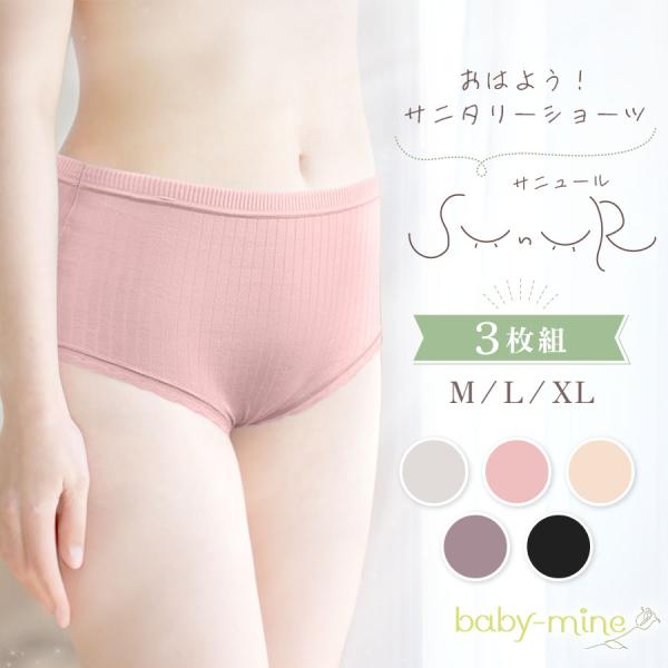 サニタリーショーツ 綿 深め 3枚セット 夜用 生理用ショーツ 敏感肌対応 生理 レディース 下着 おしゃれカラー サニュール baby-mine
