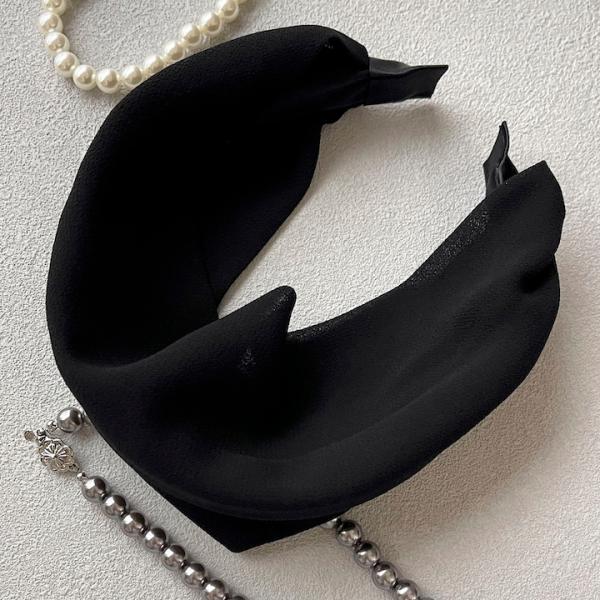 ブラックの幅広カチューシャ。シンプルなデザインなので冠婚葬祭などフォーマルな場面にもお使いいただけます。