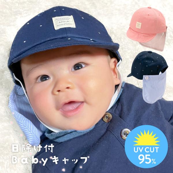 日除け付ベビーキャップ 帽子 赤ちゃん 46cm 48cm 野球帽 日よけ UV対策 紫外線対策 ハート スター 星 ストライプ かわいい キュート