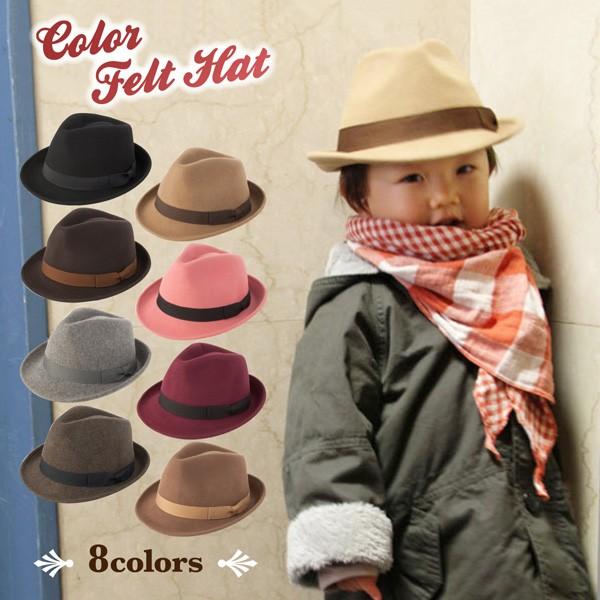 カラーフェルト中折れ帽子 レディース 帽子 メンズ キッズ ジュニア ユニセックス ウール 秋冬 防寒 暖か 大きめ サイズ調整 リボン ダンス 発表会