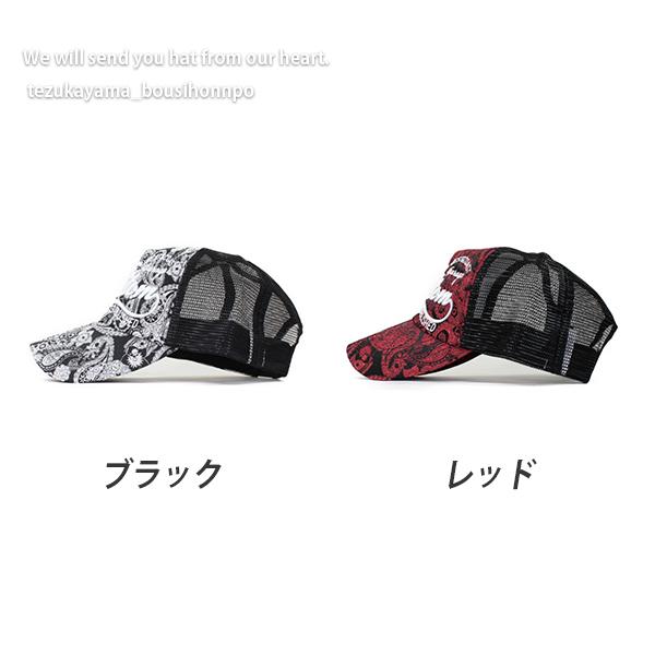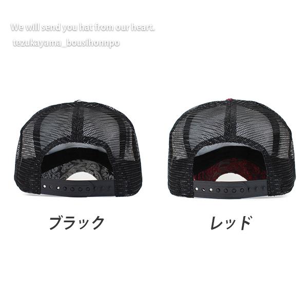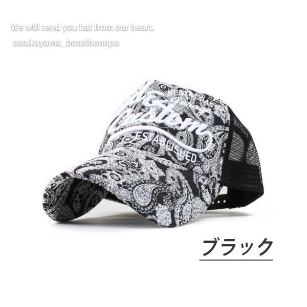 総柄×刺繍のメッシュキャップです。
