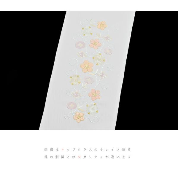 白地にピンク、薄紅色、ベージュ、薄紫、金糸の刺繍
