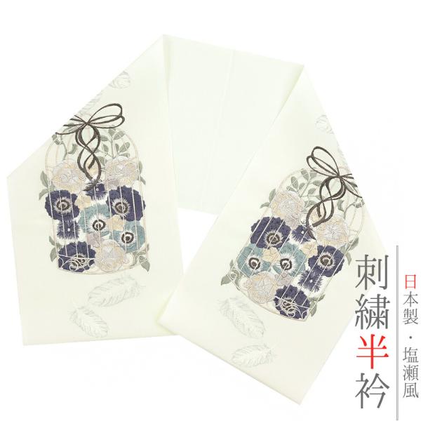 半衿 振袖 成人式 訪問着 刺繍 オフホワイト 礼装用 塩瀬 銀糸 青 藍色 青紫 水色 緑 白 鳥かご 羽 花かご リボン 洋花 結婚式 No.10-6578