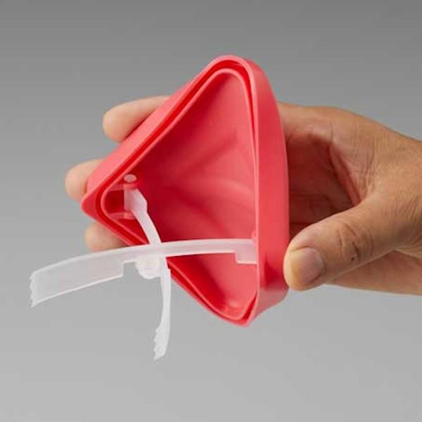 蓋の両角を持ち、蓋を折り曲げると、蓋の裏側にあるトングが開閉します。