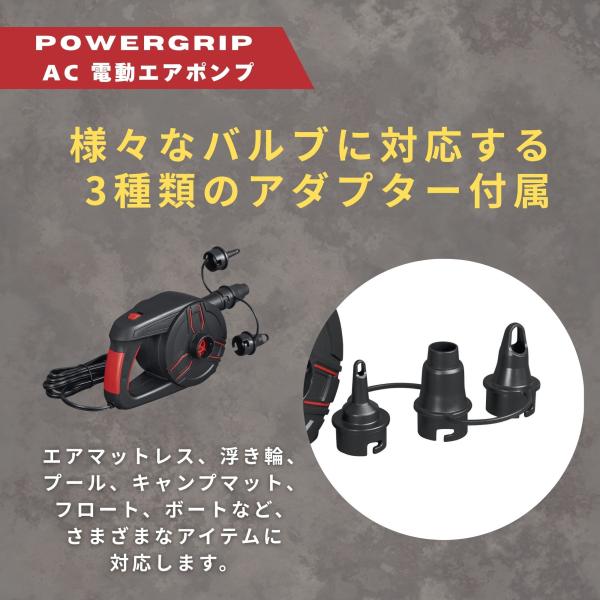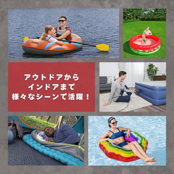 Bestway PowerGrip AC 電動エアポンプは、エアベッドやプール用品、キャンプマットなど、さまざまなエアアイテムを素早くラクに膨らませたり空気を抜いたりできる高性能ポンプです。