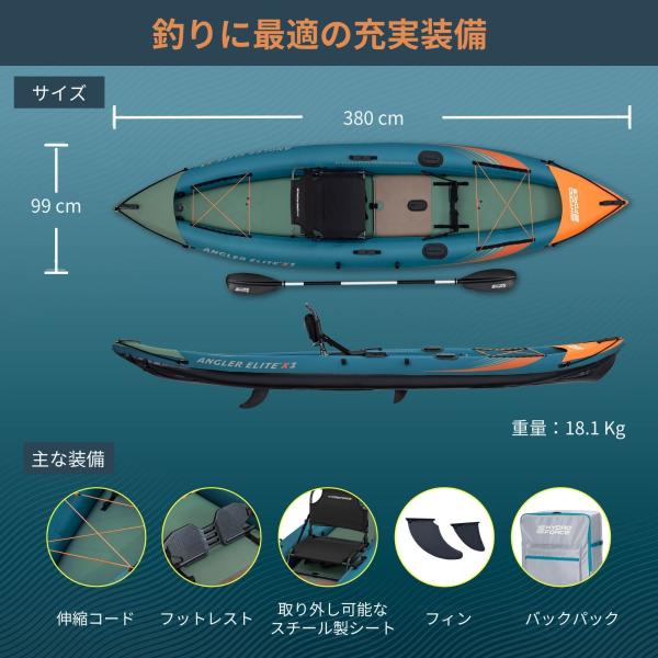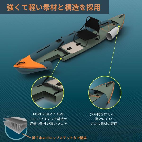 ◆全長3.80mのインフレータブルカヤックは、安定性評価4.75の高性能設計。釣りやレジャーに最適なサイズ感で、最大荷重180kgまで対応。
