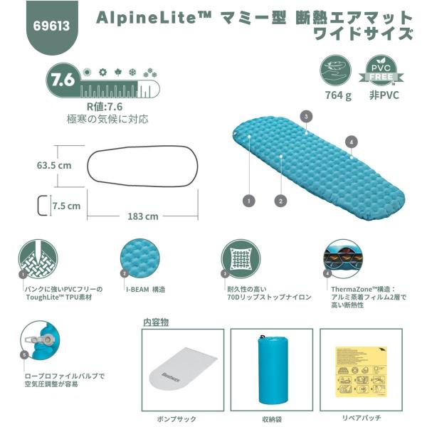 Bestway AlpineLite マミー型 エアマット ワイドサイズ 断熱 R値 7.6 軽量 764g 快適 キャンプマット インフレータブルマット 1.83m x 63.5cm x 7.5cm 69613