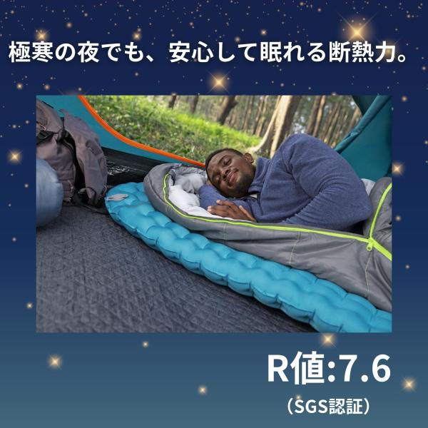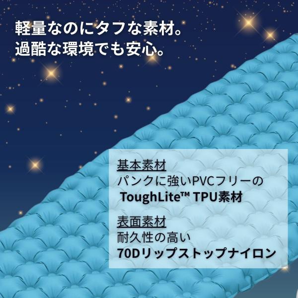 R 値が 7.6 。寒くて過酷な天候でも耐えられるアルミ蒸着フィルムを使用した ThermaZone〓 構造で、優れた断熱性と最小限の重量を実現しています。スリーピング パッドのエアポケットは、クッション性と断熱性をさらに高めます。さらに、エアパッドにはPVC素材ではない独自の耐パンク性 ToughLite TPU 素材とスポーティで耐久性のある 70D リップストップ ナイロン生地が採用されており、暖かく快適で屋外でもぐっすりと眠ることができます。