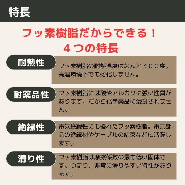 【電気を通さない・絶縁性】電気絶縁性にも優れたフッ素樹脂。電気部品の絶縁材やケーブルの結束などに活躍します。