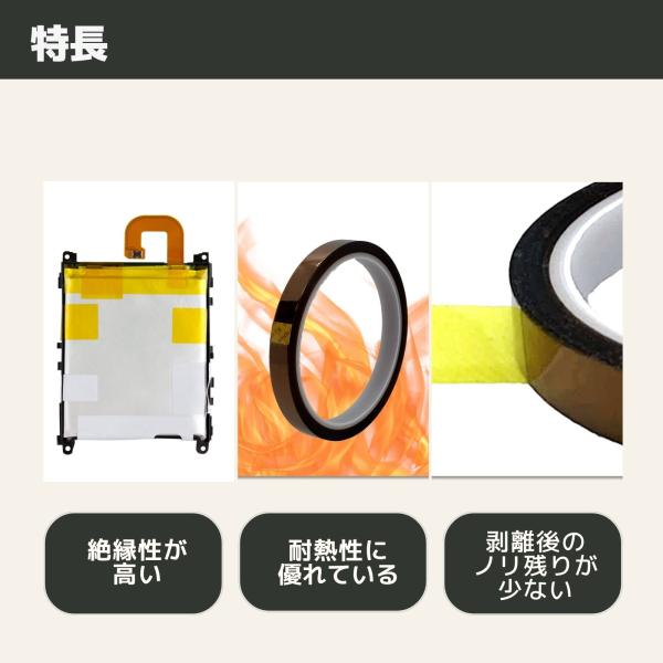 【特徴】耐熱性が高い 対薬品性が高い 初期粘着力が強い 剥離後のノリ残りが少ない