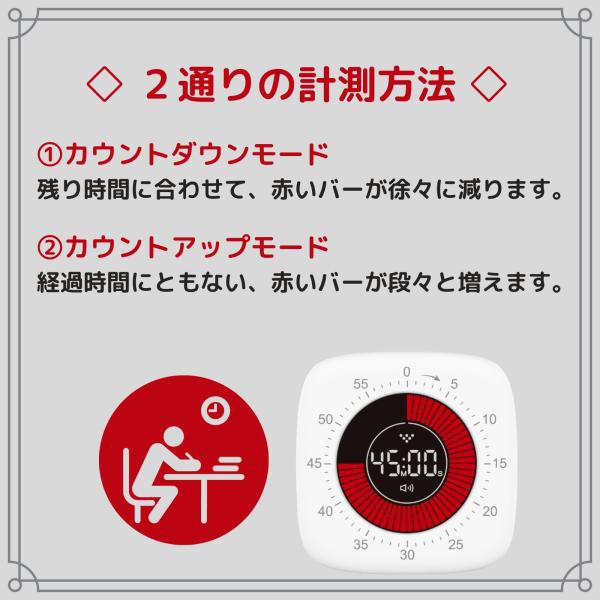 表示の点滅でお知らせするサイレントモードは静かな場所での使用におすすめです。勉強用・学習用のタイマーとして最適です。