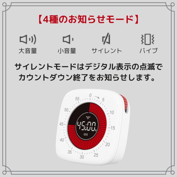 カウントダウンの時間終了をお知らせするモードは大音量・小音量・サイレント・バイブの4パターンから選べます。