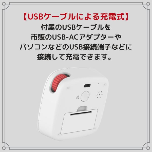 付属のUSBケーブルを 市販のUSB-ACアダプターや パソコンなどのUSB接続端子などに 接続して充電できます。