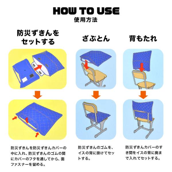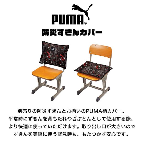別売りの防災ずきんとお揃いのPUMA柄カバー。平常時にずきんを背もたれやざぶとんとして使用する際、より快適に使っていただけます。取り出し口が大きいので、ずきんを実際に使う緊急時ももたつかず安心です。お揃い柄でぴったりサイズの防災ずきんも別売しております!