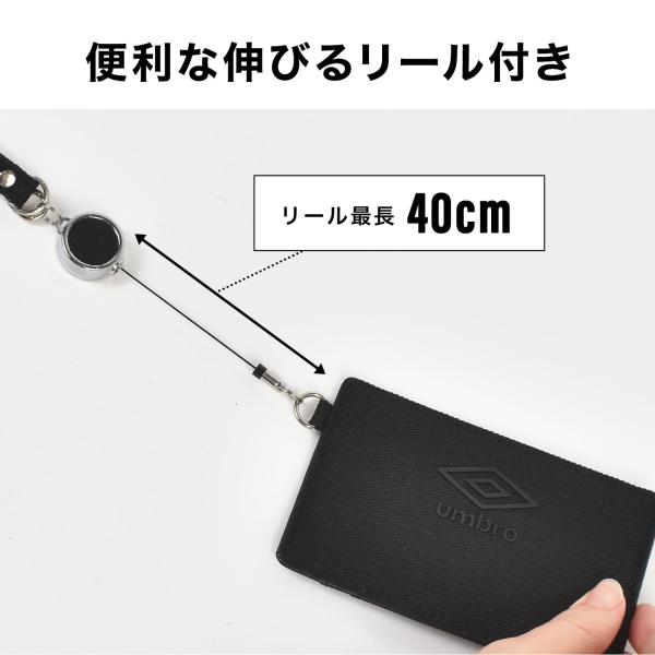 シンプルなロゴデザインがかっこいいumbro(アンブロ)のリールストラップ付きパスケース。2枚のカードをコンパクトに持ち運べ、最大40cmの伸びるリールはカバンから直接改札にタッチできて便利!年齢・性別問わず幅広く使えるアイテムです。