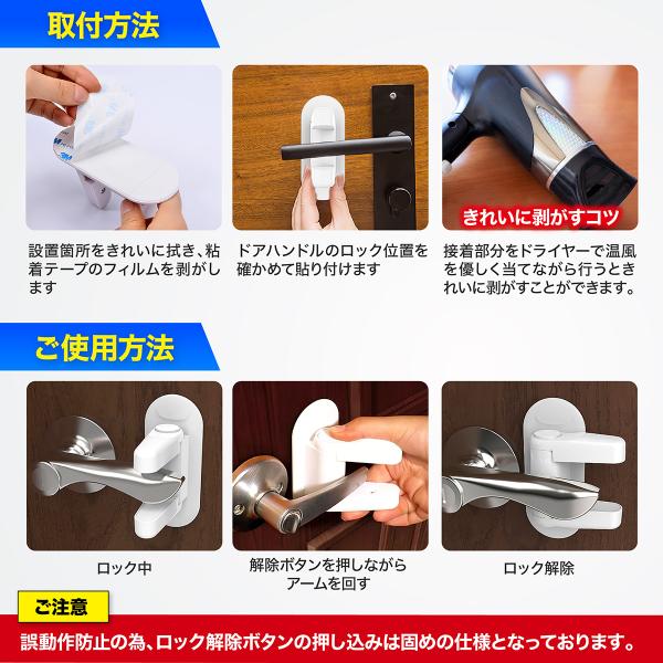 レバー式のドアノブを手軽にロックして、好奇心旺盛でいたずら好きなお子様を危険から守ります。