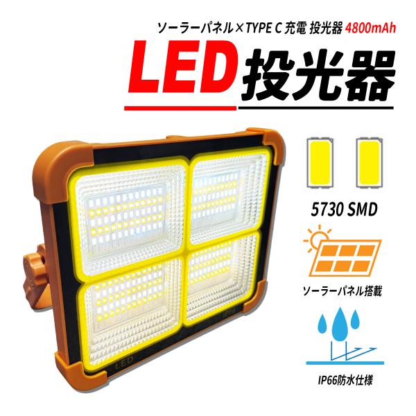 LED 投光器 照明 ソーラーパネル タイプC 200W 8000ルーメン バッテリー 4800mA アウトドア 夜間作業 災害対策 爆買