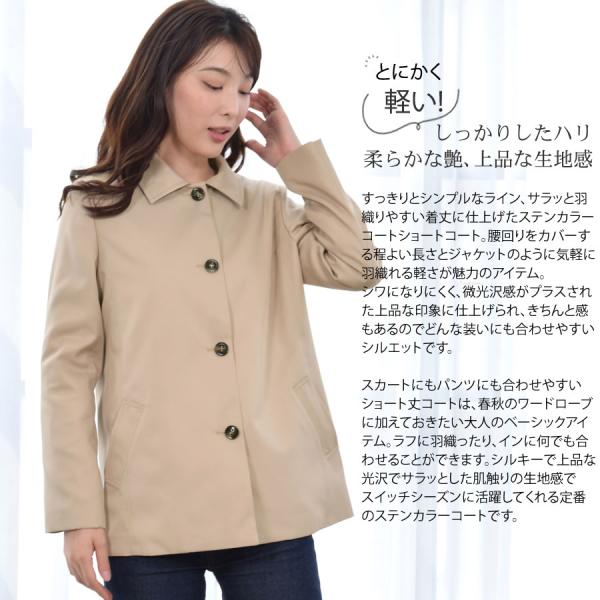 すっきりとシンプルなライン、サラッと羽織りやすい着丈に仕上げたステンカラーコートショートコート。腰回りをカバーする程よい長さとジャケットのように気軽に羽織れる軽さが魅力のアイテム。 シワになりにくく、微光沢感がプラスされた上品な印象に仕上げられ、きちんと感もあるのでどんな装いにも合わせやすいシルエットです。 スカートにもパンツにも合わせやすいショート丈コートは、春秋のワードローブに加えておきたい大人のベーシックアイテム。ラフに羽織ったり、インに何でも合わせることができます。シルキーで上品な光沢でサラッとした肌触りの生地感で スイッチシーズンに活躍してくれる定番のステンカラーコートです。