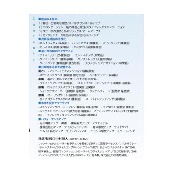 ピラティスを本格的に行うには専用スタジオのマシンを使います。そこで、効果はそのままにローラー1本で出来る画期的なエクササイズ法を中村尚人先生が考案。正しく・美しい姿勢、不調の改善、パフォーマンスアップなど、目的に応じてトレーニング出来る進化したピラティスを多数収録しています。