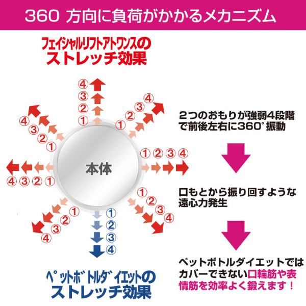 【NEWフェイシャルリフトアトワンス 防水式】本体内部のオモリが上下左右に回転することにより、遠心力を発生させ効率良くエクササイズができます。この激しい動きで日常生活では鍛えられない口輪筋をはじめとしたあらゆる表情筋に負荷を与えて効率よく鍛えることができるので衰えた表情筋により、境目のなくなったフェイスラインや垂れ落ちた頬やホウレイ線、二重あごもスッキリさせます。筋肉を効率よく鍛えるために自動的に遠心力の強さが切り替わることにより筋肉を常に緊張させます。バスタイムでも使える防水仕様(IPX7取得)でいつでもどこでも気軽に使えます。1日3分間のフェイシャルエクササイズで老け顔に見える、たるみ、二重あごをスッキリとした若々しい小顔に。■セット内容:本体、マウスカバー、単4形乾電池×2(動作確認用)■使用電池:単4乾電池2本■製造国:日本【販売者】株式会社オムニ【関連キーワード】表情筋トレーニング器具 表情筋 トレーニング エクササイズ 笑顔 表情筋トレーニング フェイシャルリフト アトワンス 表情筋の鍛え方 表情筋を鍛える 表情筋エクササイズ 頬 たるみ 二重アゴ ほうれい線 用品 グッズ おすすめ 人気 通販 販売