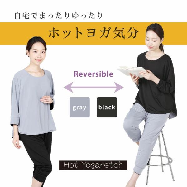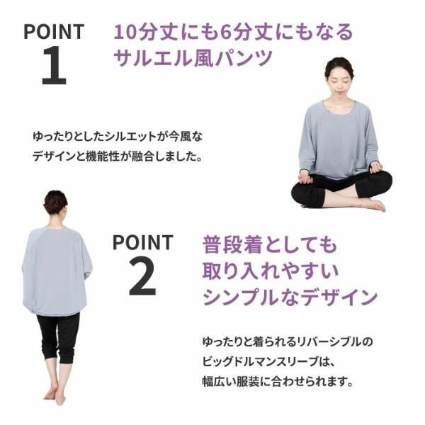 【ホットヨガレッチ】自宅でまったりホットヨガ気分!ゆったりウェアで効率よく発汗。体の締めつけが苦手な人や、街着に近い感覚のファッションがお好きな女性向けのウエスト・ヒップ周りにゆとりのあるリラックス系ヨガコーデでホットヨガ気分。■POINT[1]10分丈にも6分丈にもなるサルエル風パンツ。ゆったりとしたシルエットが今風なデザインと機能性が融合しました。■POINT[2]普段着としても取り入れやすいシンプルなデザイン。ゆったりと着られるリバーシブルタイプのビッグドルマンスリーブは、幅広い服装に合わせられます。●魔法ビン構造で保温&発汗。5層の魔法ビン、サウナ構造![1]内生地[2]内空気層[3]ポリウレタンフィルム[4]外空気層[5]外生地 極薄ポリウレタン層が外気を遮断することで身体の熱を逃さず保温し、衣類内の温度を高めます。さらに、水を通さないので汗ジミも気になりません。【関連キーワード】サウナスーツ ダイエットウエア ヨガ ウェア ホットヨガウェア セット レディース HOT YOGARETCH 上下セット ヨガウェア ホットヨガ ウェア おしゃれ Hot Yoga ブラック グレー リバーシブル サルエル風パンツ ゆったり グッズ 送料無料 おすすめ 人気