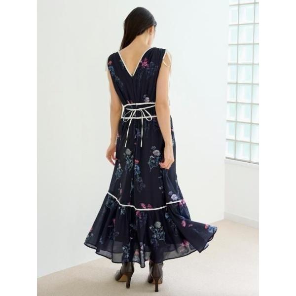 鮮やかで上品な花柄が目を惹く、フラワープリントのふんわりティアードワンピースが登場。ショルダーは今季らしいドロスト仕様で華やかに。華奢な長めのリボンが顔まわりを明るく演出します。