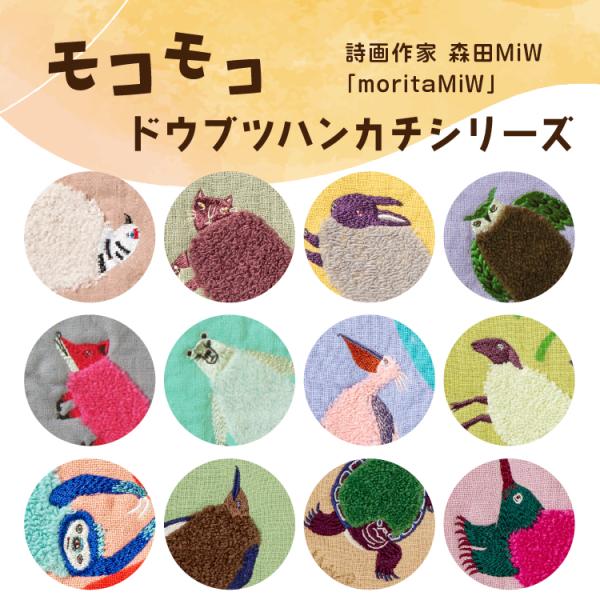 ハンドタオル ハンカチ moritaMiW モコモコドウブツハンカチ 全12種 綿100% 詩画作家 森田MiW 楠橋紋織 コラボ お配りギフト