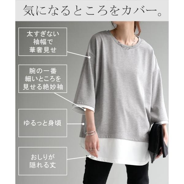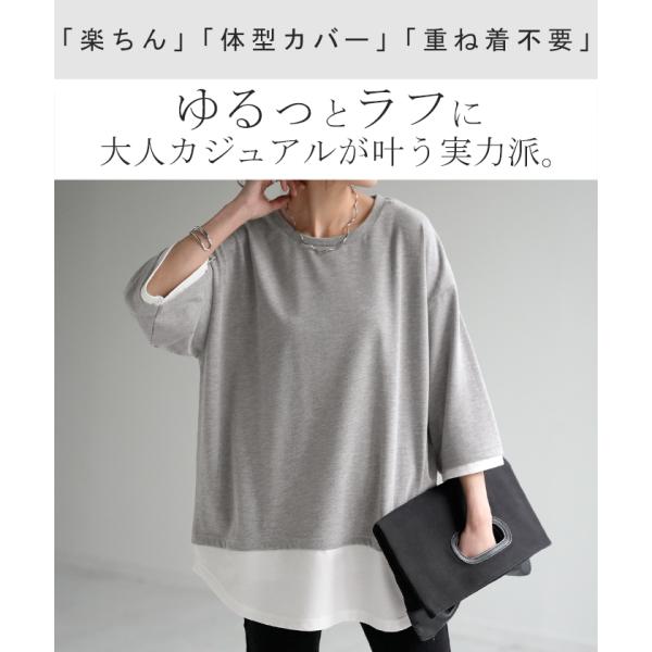 カットソー Tシャツ レイヤード 風 重ね着 二の腕カバー ドルマン ロング トップス ティーシャツ レディース