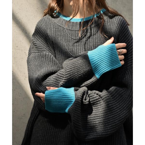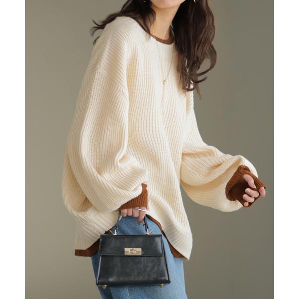 ニット バイカラー リブ編み レディース トップス セーター プルオーバー 長袖 配色 ボリュームスリーブ クルーネック サムホール リブ