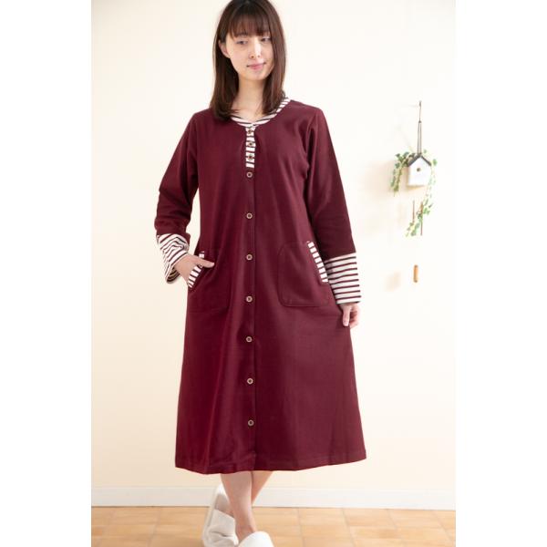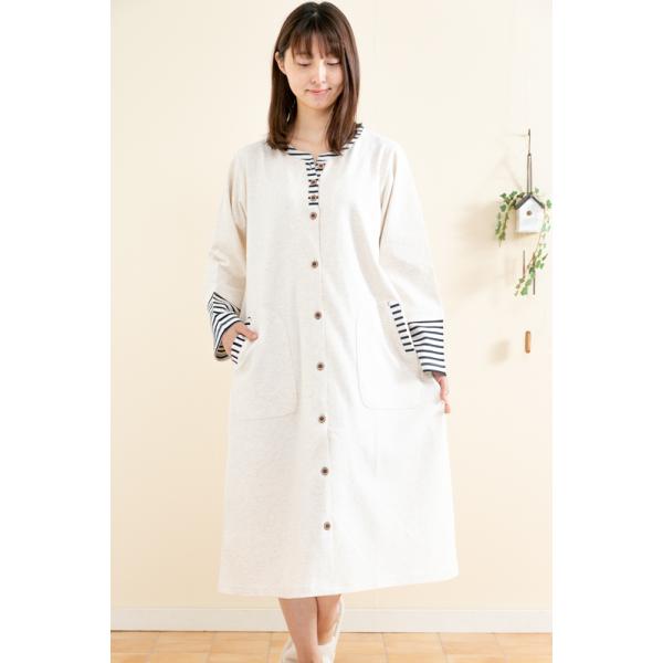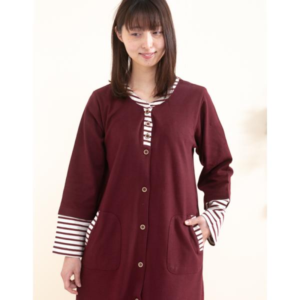 ワンピース 前開き やや厚めなニット地ボーダー切り替え ネグリジェ ルームウエア パジャマ 春秋 入院準備 長袖 ナイトウェア レディース 3Lあり