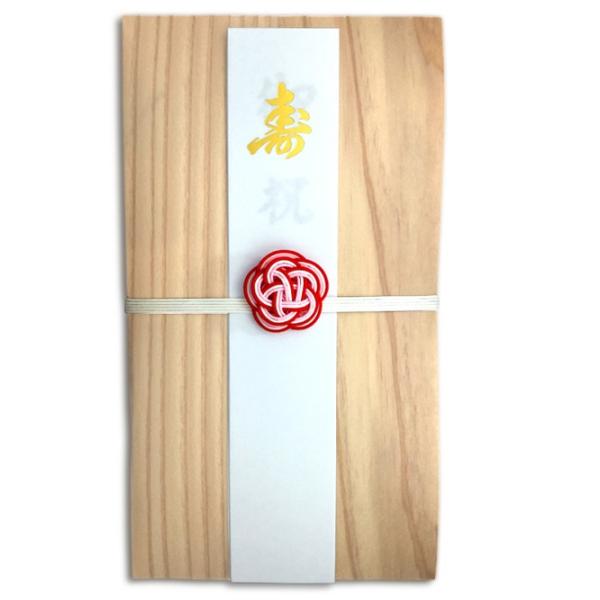 フイルムコーティングされた天然の杉シートで作られた木の祝儀袋。天然の木目模様があたたかさを与えてくれると同時に、月日を重ねた喜びを感じさせてくれるこの祝儀袋は、結婚式などのお祝いに喜ばれています。中袋1枚・短冊3枚入り(寿/御祝/無地) ※黒字印刷105×190mm