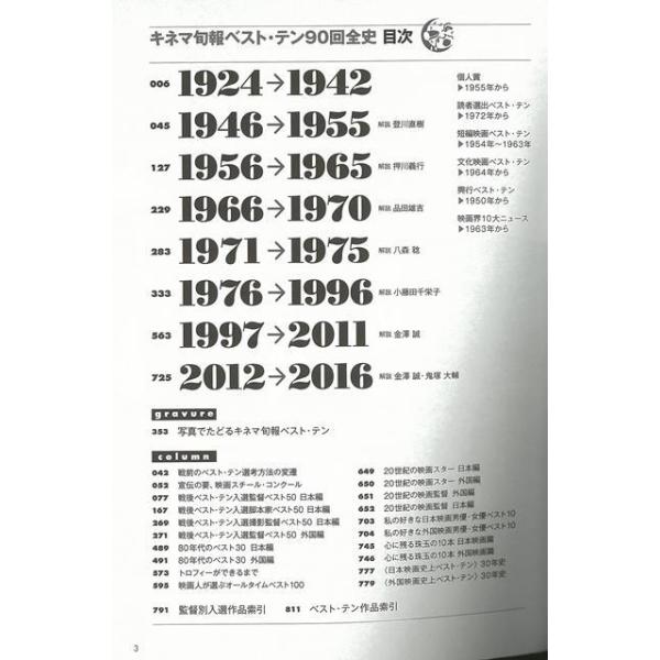 1924年の第1回開催以来、戦争による中断をはさんで 2016年のベスト・テンで90回を数えたキネマ旬報ベスト・テン。各年度のベスト・テン結果のデータおよびランク入りした全作品の順位紹介を中心に、戦後は各年度の映画状況、興行ベスト・テンや映画界10大ニュース、コラムやデータも充実させた永久保存決定版!