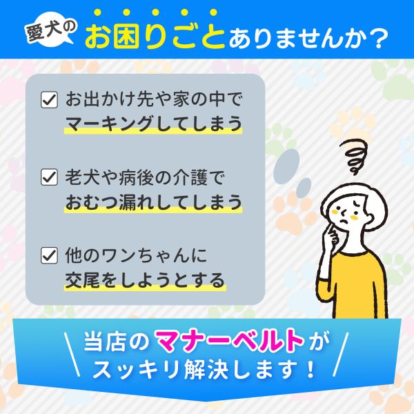 お出かけ先や家の中でのマーキングや老犬や病後の介護でのおむつ漏れ、他のワンちゃんにちょっかいを出してしまうなどのお困りごとをマナーベルトでスッキリ解決できます。