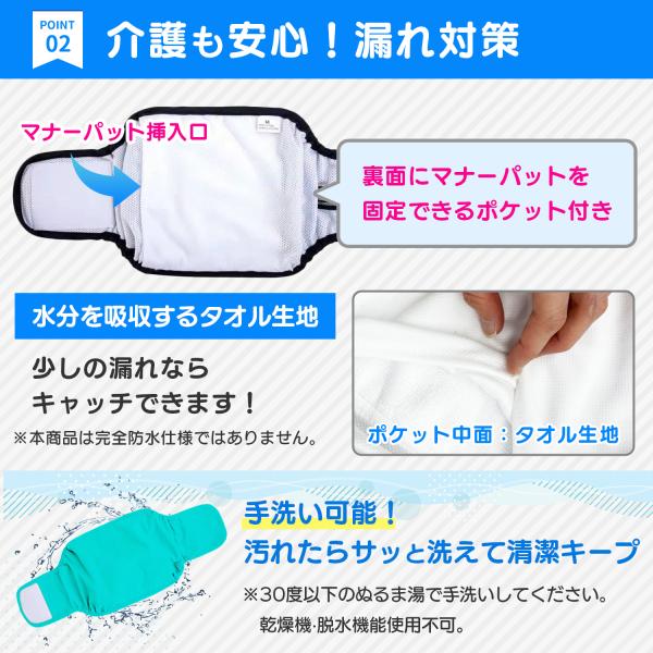 体型に合わせて調整可能なマジックテープや背面内側のゴムが身体にフィットしマナーベルトのズレを防止します。